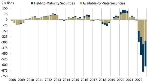 The problem this creates for banks is simple: when rates moved higher as the Federal Reserve sought to combat inflation, it lowered the value of existing bonds on banks’ balance sheets. The FDIC in February reported that U.S. banks’ unrealized losses on available-for-sale and held-to-maturity securities totaled $620 billion as of Dec. 31, up from $8 billion a year earlier before the Fed’s rate push began (above).
