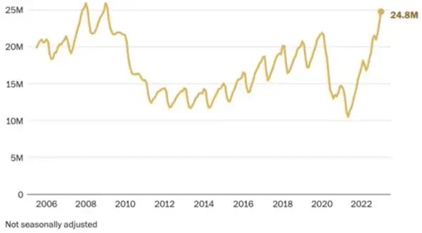 It’s not just the unrealized losses on their bond portfolios that may cause further stress in the banking sector. We discussed growing concerns in the real estate market in last weeks’ Market Insights piece, which most certainly impacts banks. We may also be facing a corporate and consumer loan default issue. As seen below, delinquencies on consumer loans have skyrocketed in recent months, reaching levels we haven’t seen since the Great Financial Crisis.