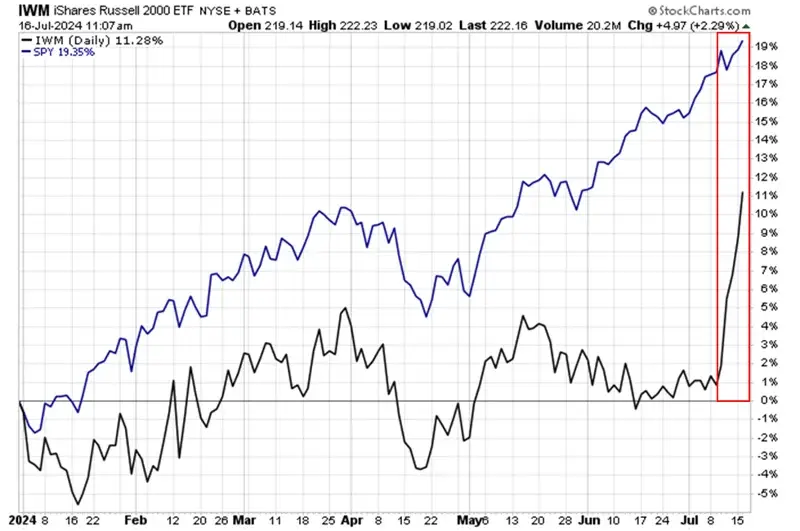 However, with last week’s better-than-expected CPI inflation report, a potential shift has taken place as the more interest rate-sensitive small-cap sector has started to take off. Last week, the small-cap index, the Russell 2000, advanced by 6%, outperforming the S&P 500 for the week by the largest such margin since April 2020. Encouragingly, the trend has continued into this week, with the index rising an astounding 10.3% in five trading days (through July 15th), compared to just 1.08% for the S&P 500 over the same period (chart below).
